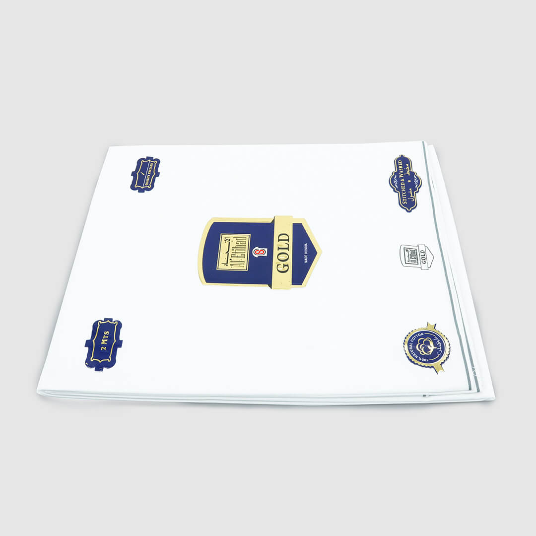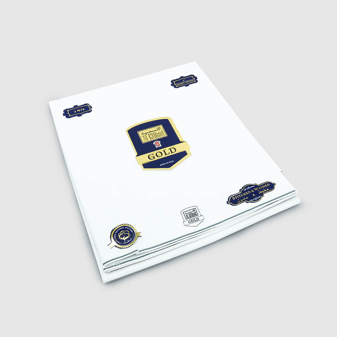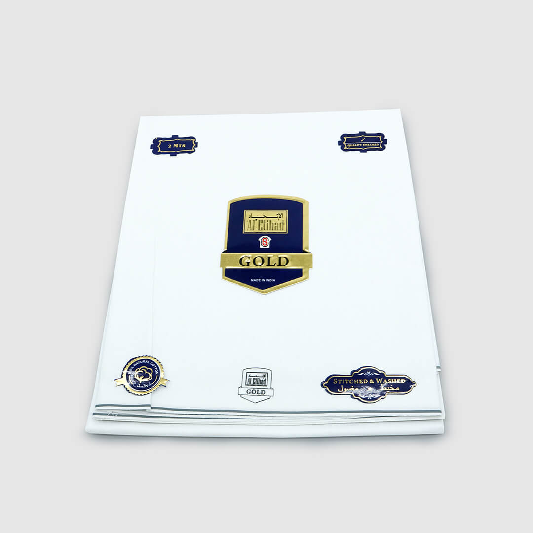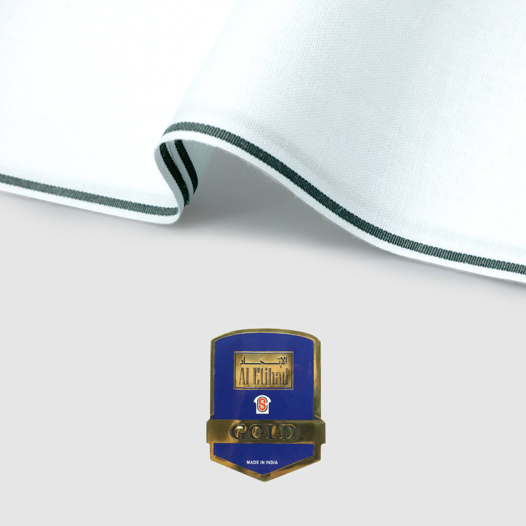 تقدم شركة الاتحاد الذهبية وزار قطني مصنوع من القطن الصافي بنسبة 100%. يمنح طرف الوزار مظهرًا أنيقًا ويجعله مثالي للاستخدام المنتظم. (متوفر بخامات بيضاء سادة بألوان مختلفة على الأطراف.)